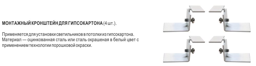Устанавливаются в подвесных потолках типа "Armstrong" или в потолках из гипсокартона. Для установки светильника в потолок из гипсокартона в корпусе предусмотрены специальные отверстия, и светильник комплектуется четырьмя кронштейнами (заказываются отдельно).