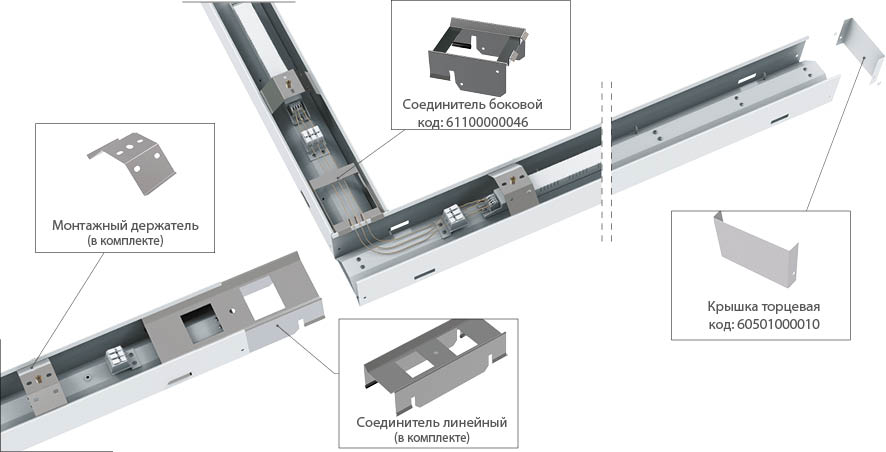 В начале и в конце “линии” светильников устанавливаются торцевые крышки.