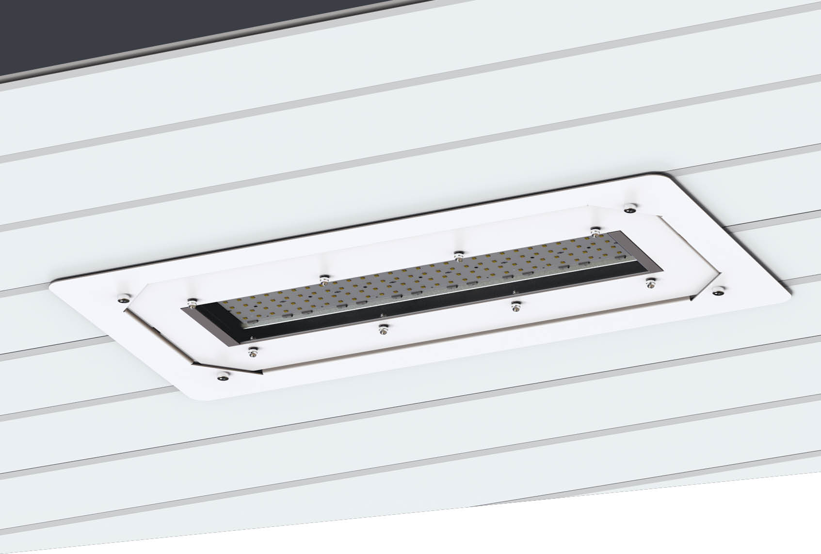 Светильник устанавливается в подвесные потолки помещений различных назначений (навесов АЗС и производства, склады, ангары, торговые площади и т.д). Комплектуется внешней рамкой и специальными фиксирующими кронштейнами. Фиксация светильника осуществляется через отверстия в рамке с помощью винтов.
